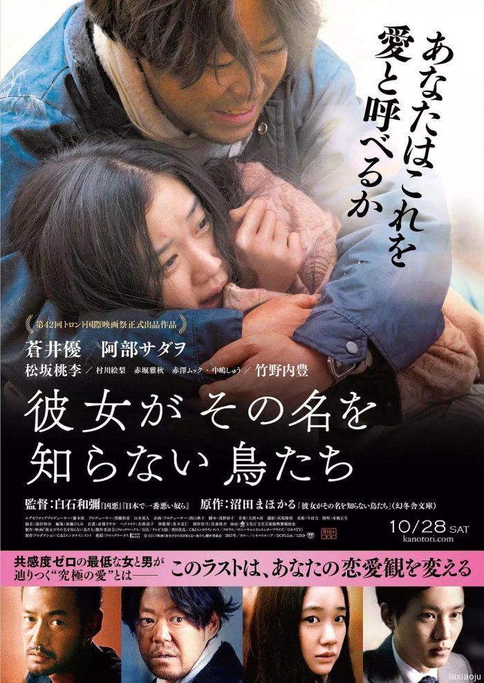 导演: 白石和弥 编剧: 浅野妙子 / 沼田真帆香留 主演: 苍井优 / 阿部隆史 / 松坂桃李 / 村川绘梨 / 赤堀雅秋 / 赤泽セリ / 中岛书 / 竹野内丰 类型: 剧情 / 悬疑 制片国家/地区: 日本 语言: 日语 上映日期: 2017-09-07(多伦多电影节) / 2017-10-28(日本) 片长: 123分钟 又名: 鸟兽行(港) / 她不知道那些鸟的名字(台) / 未闻鸟名(豆友译名) / Birds Without Names IMDb: tt6493644 她不知道名字的那些鸟儿的剧情简介 · · · · · · 北原十和子(苍井优饰)与比她大15岁的佐野阵冶(阿部贞夫饰)莫名同居,阵冶完全是「高富帅」的相反。于是,她暗地勾搭上有妇之夫水岛真(松坂桃李饰),同时又念念不忘八年前分手的前男友黑崎俊一(竹野内丰饰)。阵冶发现十和子的奸情,开始骚扰水岛的家人与工作,使出各种下流手段,并 说出「只要是为了十和子,我什么事都做得出来」。某天,警察上门来调查黑崎的失踪案件,于是十和子开始怀疑黑崎的失踪案是否和阵冶有关?苍井优饰演周旋于三个渣男之间的恶女,三个渣男,一个比一个还渣!日本直接打出「全员差劲!不快度百分百」的宣传。惊人的结局,爽快度破表。 第41届日本电影学院奖 最佳女主角 苍井优 第12届亚洲电影大奖 最佳女主角(提名) 苍井优 第42届报知映画赏 最佳女主角 苍井优 她不知道名字的那些鸟儿的下载地址 · · · · · · 百度网盘(蓝光720P内嵌中字视频 翻译:猪猪日剧字幕组): 本部分内容设定了隐藏,需要登录后才能看到 磁力: